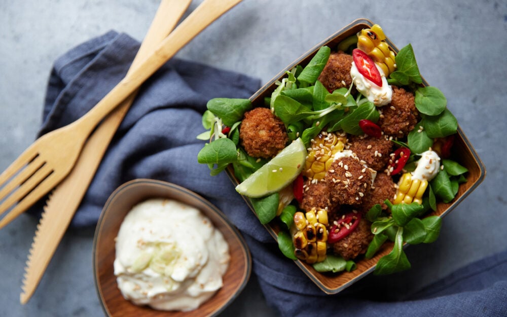 Grillet majssalat med friterede planteballs