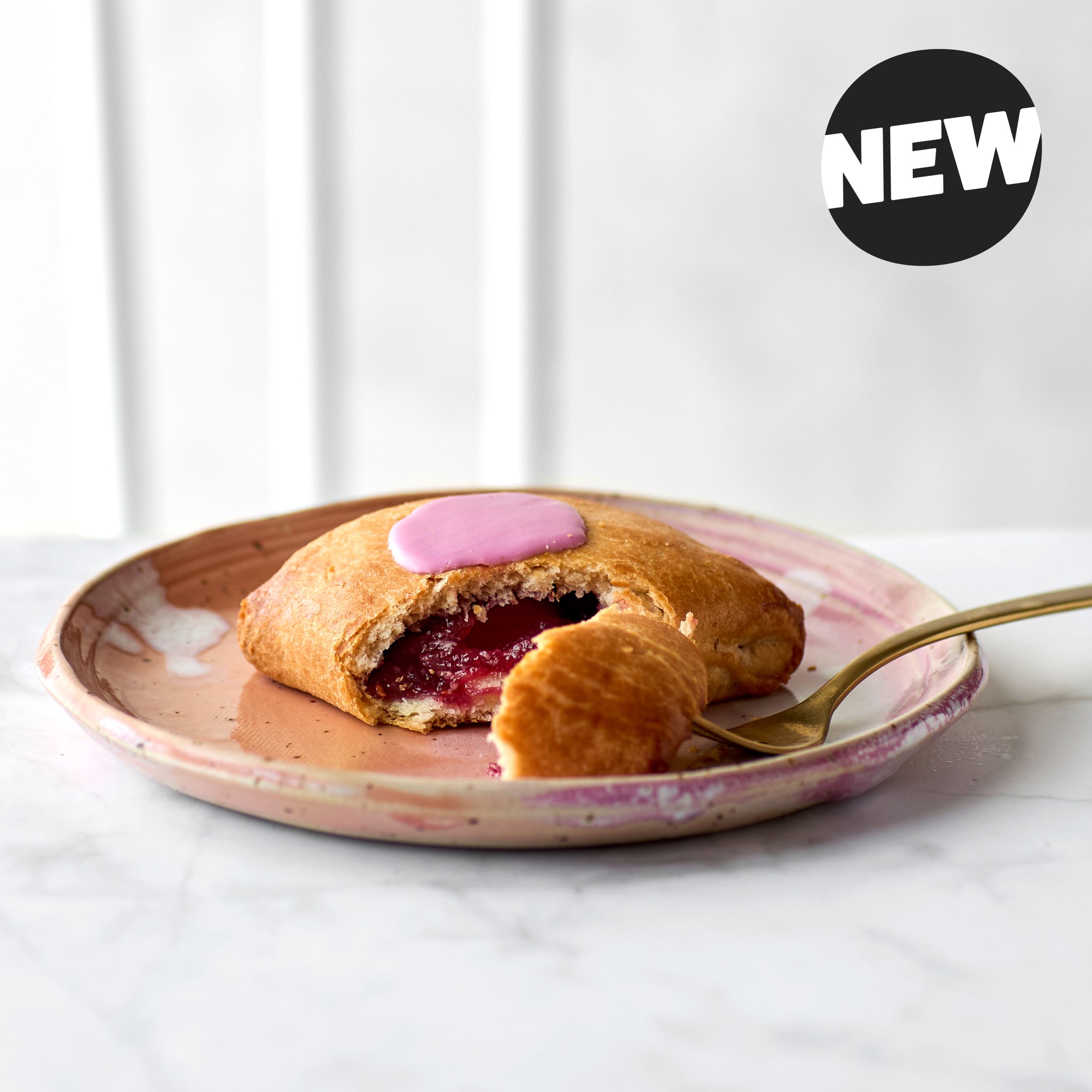 Hindbærbolleen er bagt med blød gærdej, fyldt med frisk og syrligt hindbærfyld og lyserød glasur.